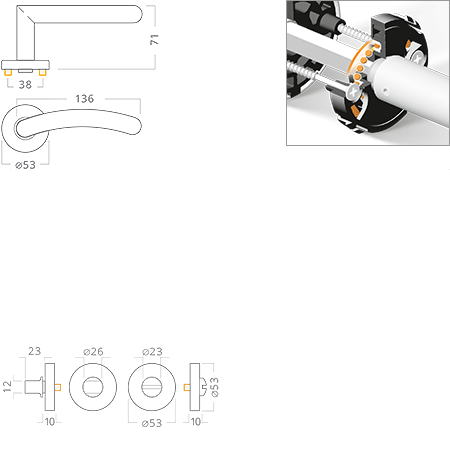 Nerezové kování s novou technologií ložiskových rozet. Vhodné pro zátěžové prostory se zvýšeným pohybem veřejnosti, jako jsou veřejné toalety, správní budovy, stadiony. Pro svůj tichý chod jsou vhodné i pro byty, domácnosti a kanceláře. Materiál: nerez AISI 304.