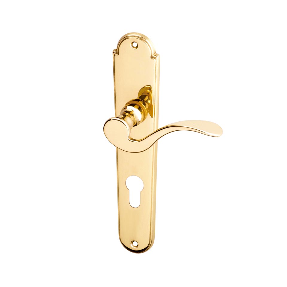 Štítové kování mosazné s tvarovaným štítem a klikou.